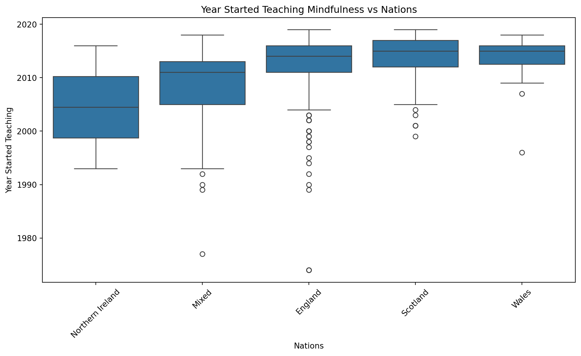 The ANOVA test revealed significant differences in the starting years across nations, indicating variability in when mindfulness teaching was initiated in different regions. Key insights include Northern Ireland having the earliest median starting year, contrasted with Wales and Scotland having the latest. The ANOVA test, used for the numeric variable year_started, highlights significant differences in the start year of mindfulness teaching across nations.